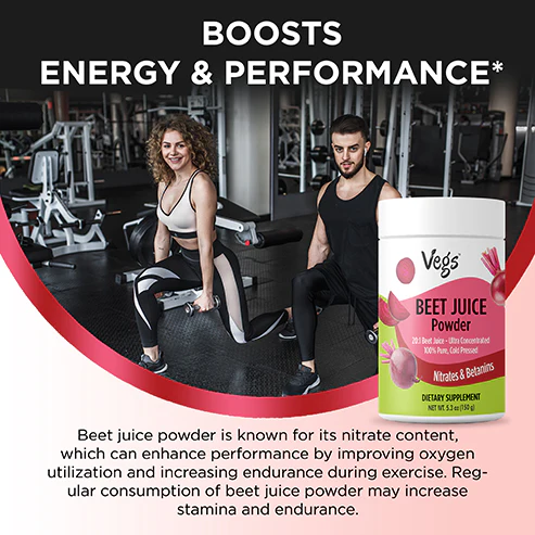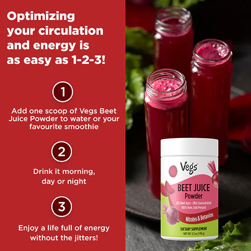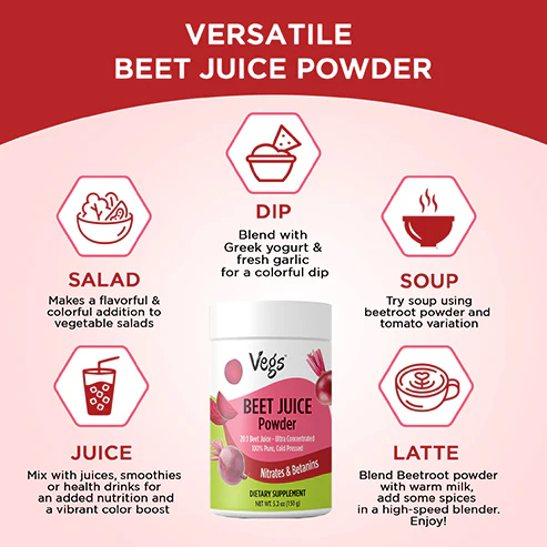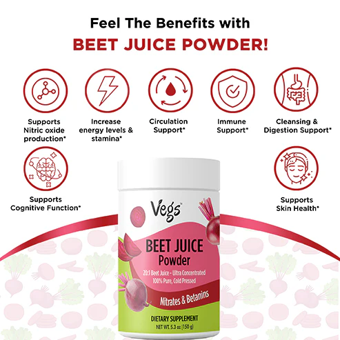 Fuel your day with Vegs Organic Beet Root Juice Powder, a 100% freeze-dried beetroot powder made from premium organic beets. This organic beetroot powder is rich in antioxidants, vitamins, and minerals that support energy, stamina, circulation, and daily wellness naturally.