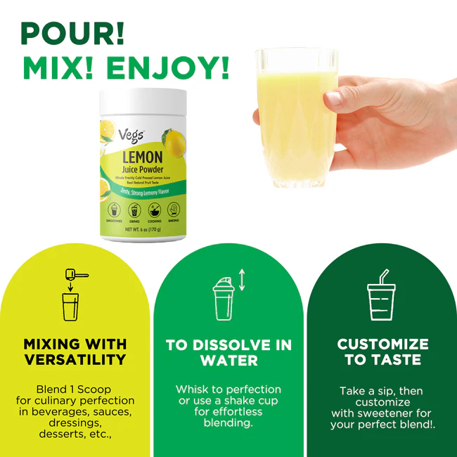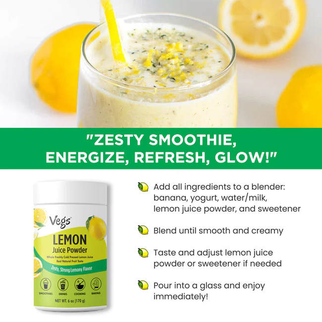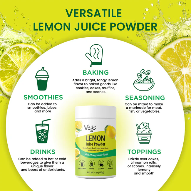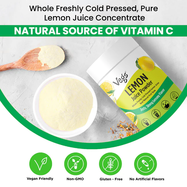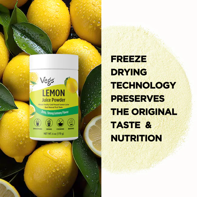 Vegs Organic Lemon Juice Powder brings the bright, zesty flavor of real lemons in a convenient freeze-dried form. Made from fresh, organic lemons, this plant-based citrus powder is naturally rich in vitamin C, antioxidants, and essential nutrients that support everyday wellness.