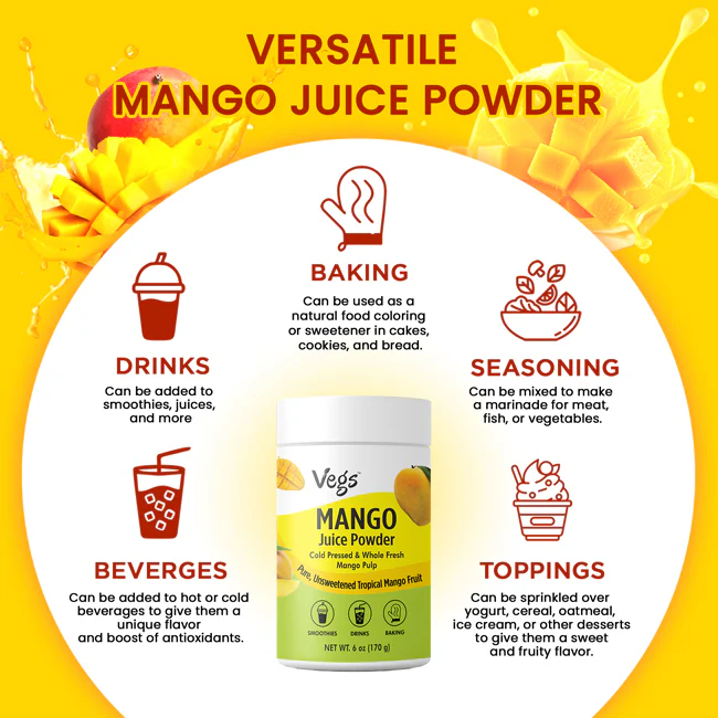 Savor tropical nutrition with Mango Juice Powder, a vitamin-rich superfood. Our Organic Mango Juice Powder is pure, natural, and nutrient-dense. Enjoy Pure Mango Juice Powder as a daily immune support powder. Use Natural Mango Powder as a smoothie ingredient or beverage additive. Perfect Mango Powder for Beverages to enhance flavor and wellness. Premium Premium Mango Juice Powder for energy and antioxidant support. Dehydrated Mango Powder is convenient for recipes and smoothies. Cold-Pressed Mango Powder retains nutrients and tropical flavor. Mango Superfood Powder supports vitality, detox, and plant-based nutrition. Mango Fruit Powder is a vegan superfood blend for daily wellness.