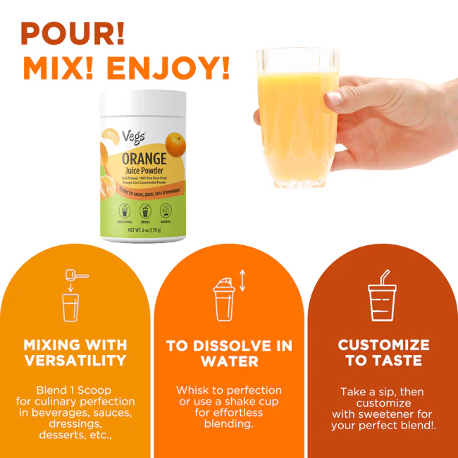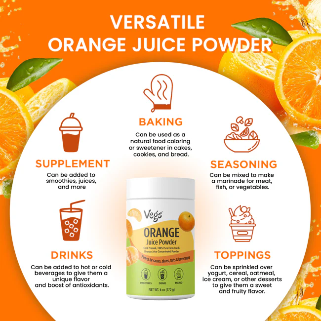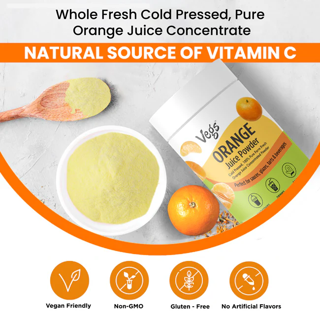 Boost your daily wellness with Vegs Organic Orange Juice Powder, a 100% freeze-dried orange juice powder made from pure, nutrient-dense fruit. This organic orange juice powder is rich in vitamin C and antioxidants, helping support natural energy, immunity, and overall wellness.