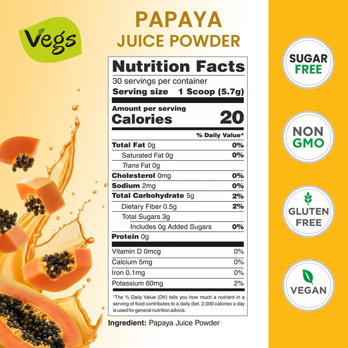 Enjoy the tropical goodness of Vegs Papaya Juice Powder, a 100% freeze-dried papaya juice powder made from ripe, nutrient-rich papayas. This organic papaya juice powder is packed with vitamins A, C, E, folate, essential minerals, and natural enzymes for complete daily wellness.