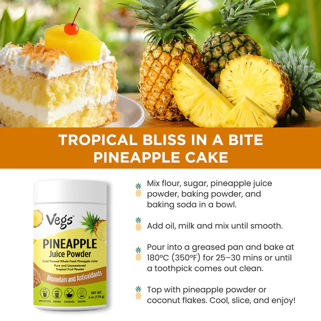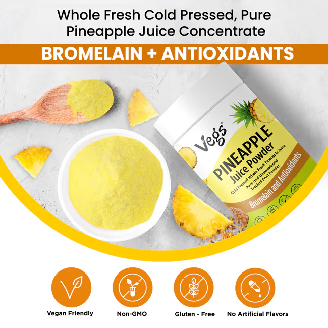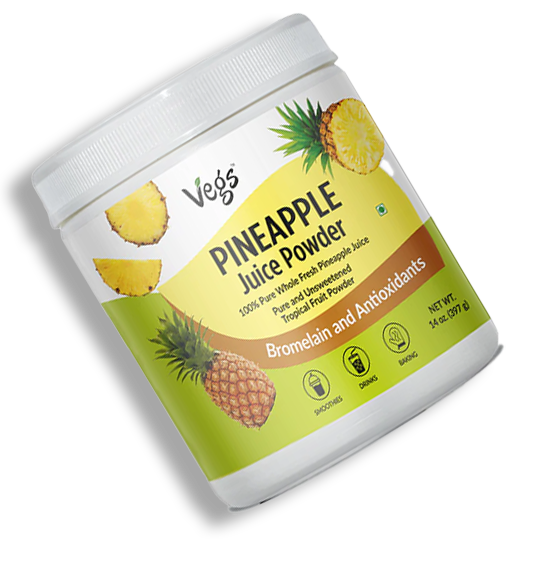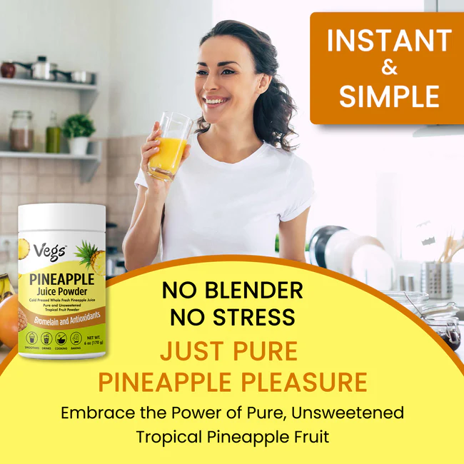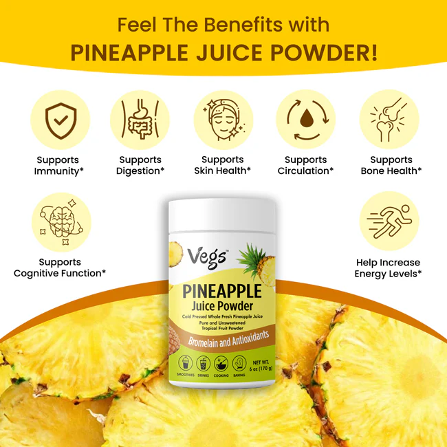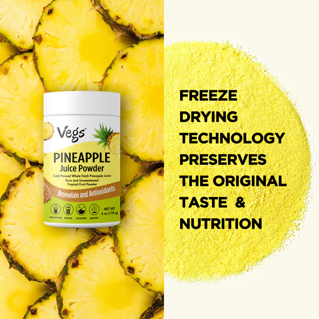 Enjoy the tropical goodness of Vegs Organic Pineapple Juice Powder, crafted from 100% freeze-dried organic pineapple to lock in natural flavor, aroma, and nutrition. This natural pineapple juice powder is a vegan superfood juice powder, rich in vitamin C, antioxidants, and pure plant-based energy to support daily wellness.