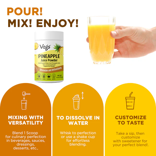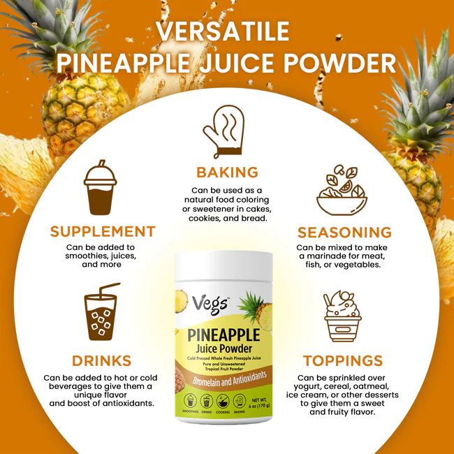 Perfect as a pineapple juice powder smoothie mix powder, pineapple fruit powder, or vegan pineapple drink mix, it blends easily into smoothies, juices, teas, and other recipes. Add this organic pineapple powder to your favorite drinks or use as a pineapple powder for smoothies, baking, or as a healthy topping for yogurt, oatmeal, or fruit bowls.