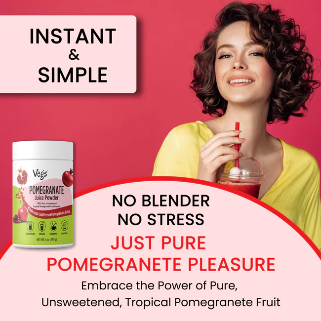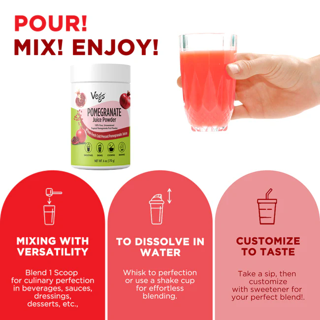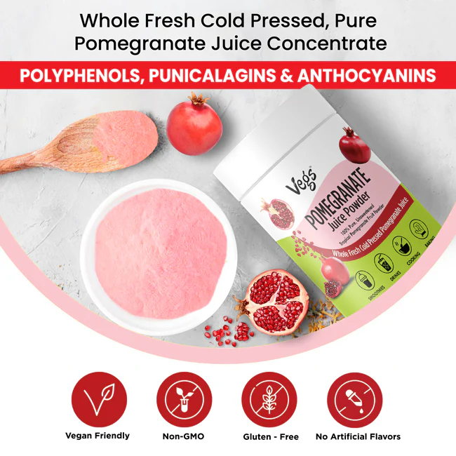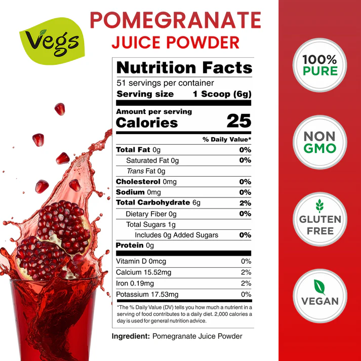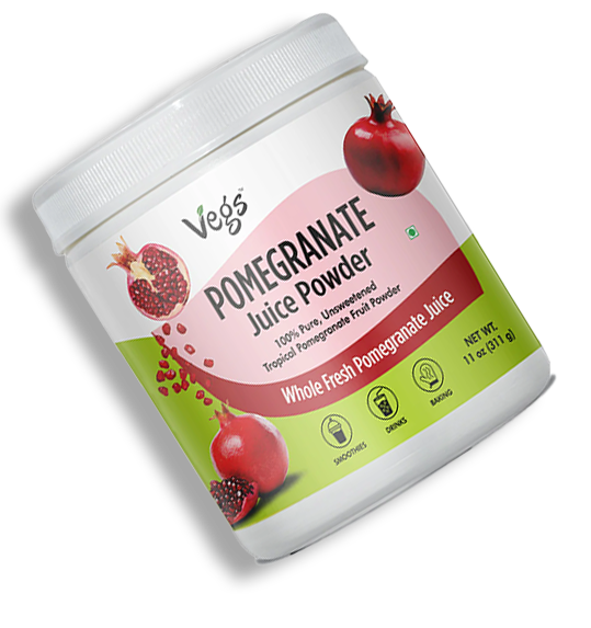 Vegs Organic Pomegranate Juice Powder is a pure and flavorful fruit powder made from 100% freeze-dried pomegranate juice. It delivers the natural taste, color, and nutrients of real pomegranates in an easy-to-use powder form.