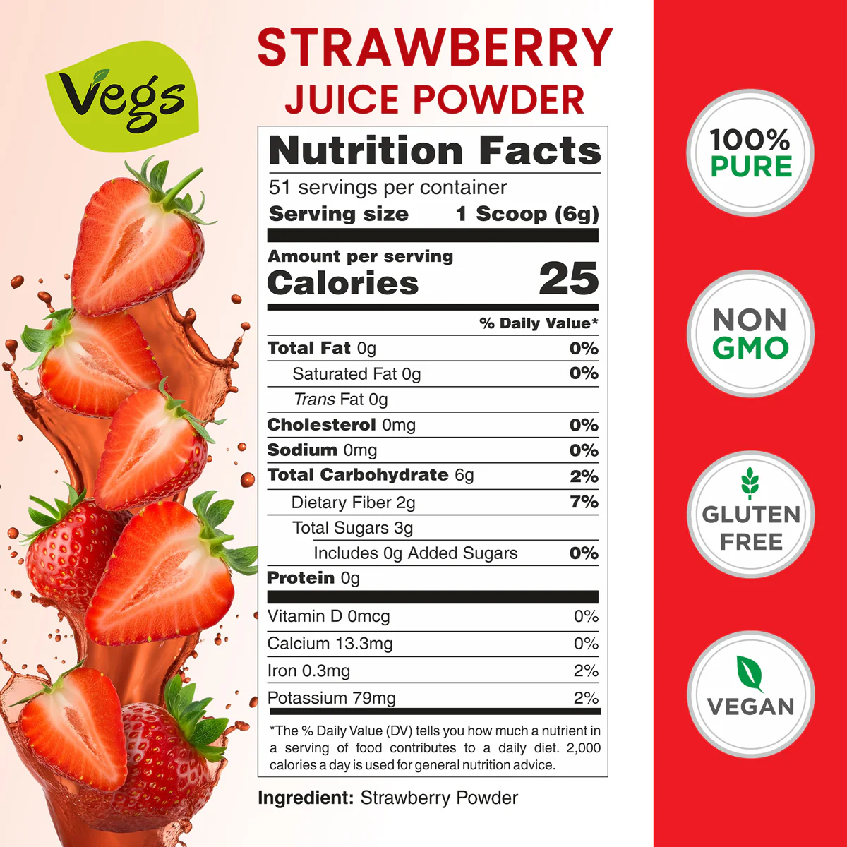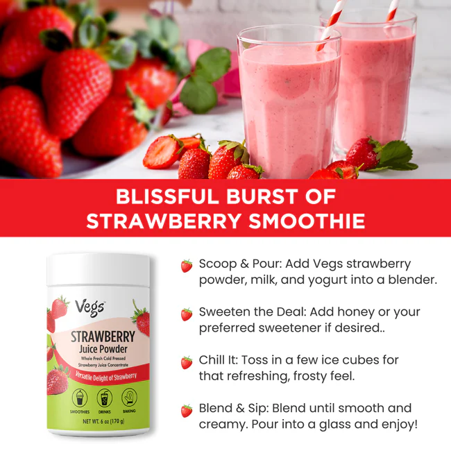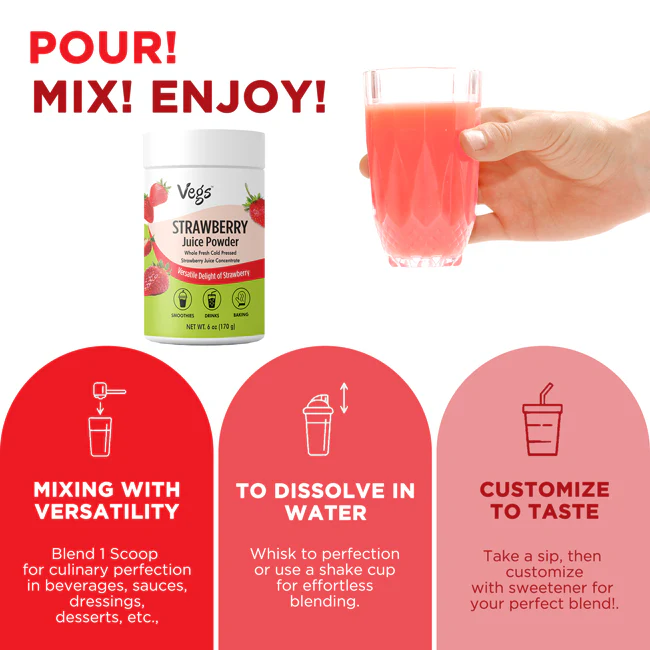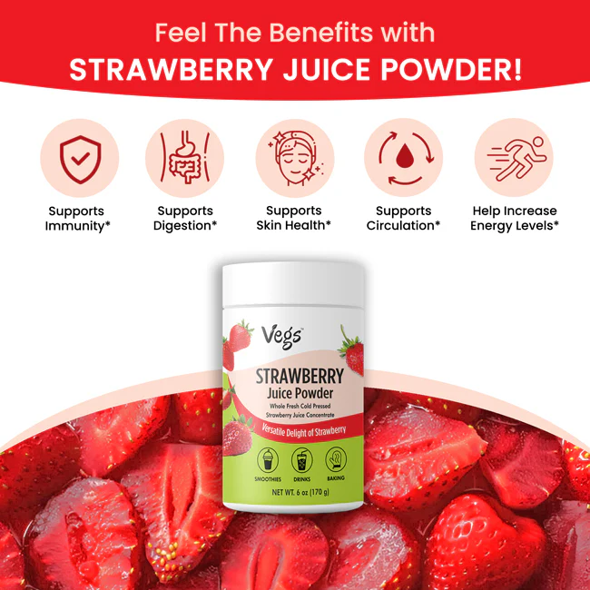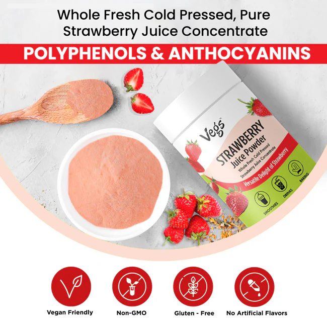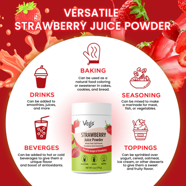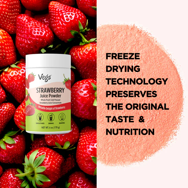 Vegs Organic Strawberry Juice Powder delivers the delicious taste of ripe strawberries in a convenient, ready-to-use fruit powder. Made from high-quality strawberries that are freeze-dried and finely ground, this powder preserves the natural sweetness, aroma, and vibrant color of real fruit.