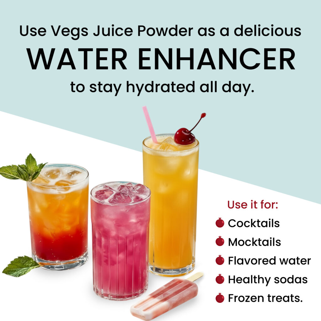 Vegs Fruit Juice Powders are a simple and natural way to enhance plain water with real fruit flavor and nutrition. Just mix a small amount into water to enjoy a refreshing, tasty drink—no artificial flavors or sweeteners needed.
